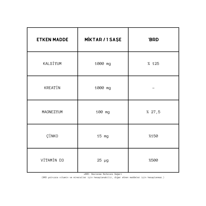 Bu ürün; kemik sağlığını, kas fonksiyonlarını, fiziksel performansı ve bağışıklık sistemini desteklemek amacıyla formüle edilmiştir.