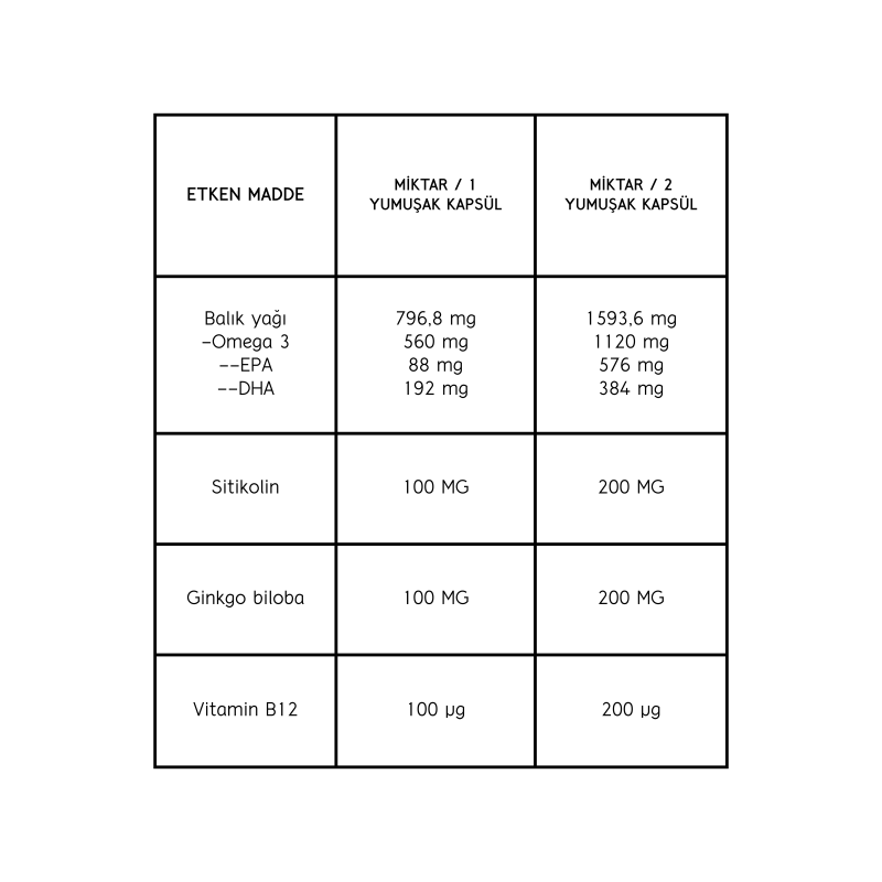 Bu ürün, beyin fonksiyonlarını, hafızayı ve sinir sistemi sağlığını desteklemek amacıyla formüle edilmiştir. İçeriğinde yer alan balık yağı (Omega-3 yağ asitleri EPA ve DHA) beyin hücrelerinin sağlıklı yapısını korumaya yardımcı olurken, Sitikolin ve Ginkgo biloba yaprak ekstresi zihinsel performans, odaklanma ve hafıza üzerinde olumlu etkiler sağlar. Vitamin B12 ise sinir sistemi ve enerji metabolizmasının normal işleyişine katkıda bulunur.