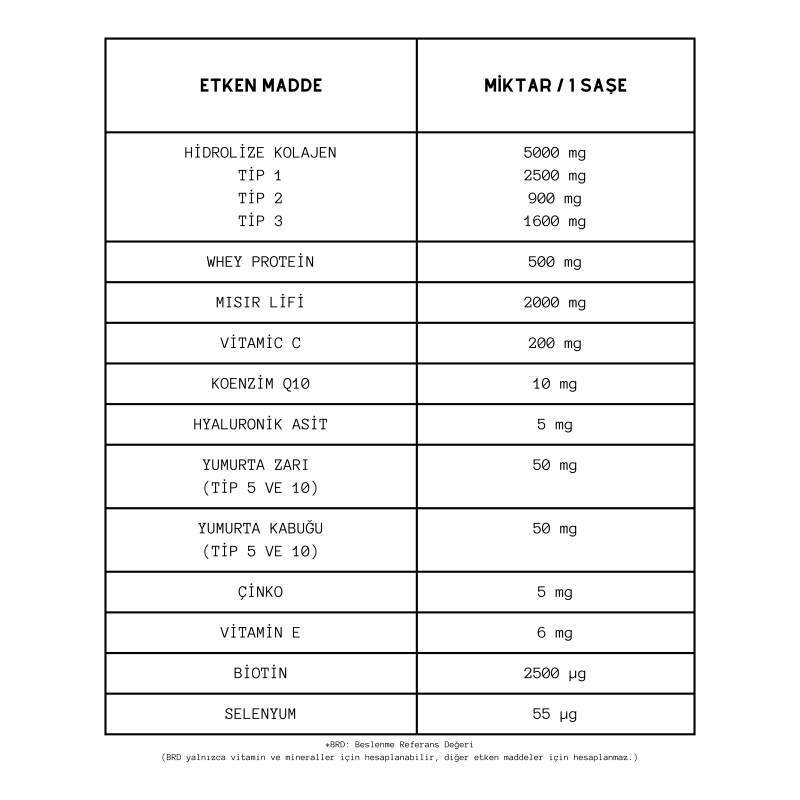 • Hidrolize kolajen Tip 1, 2, 3, 5 ve 10 içeriği